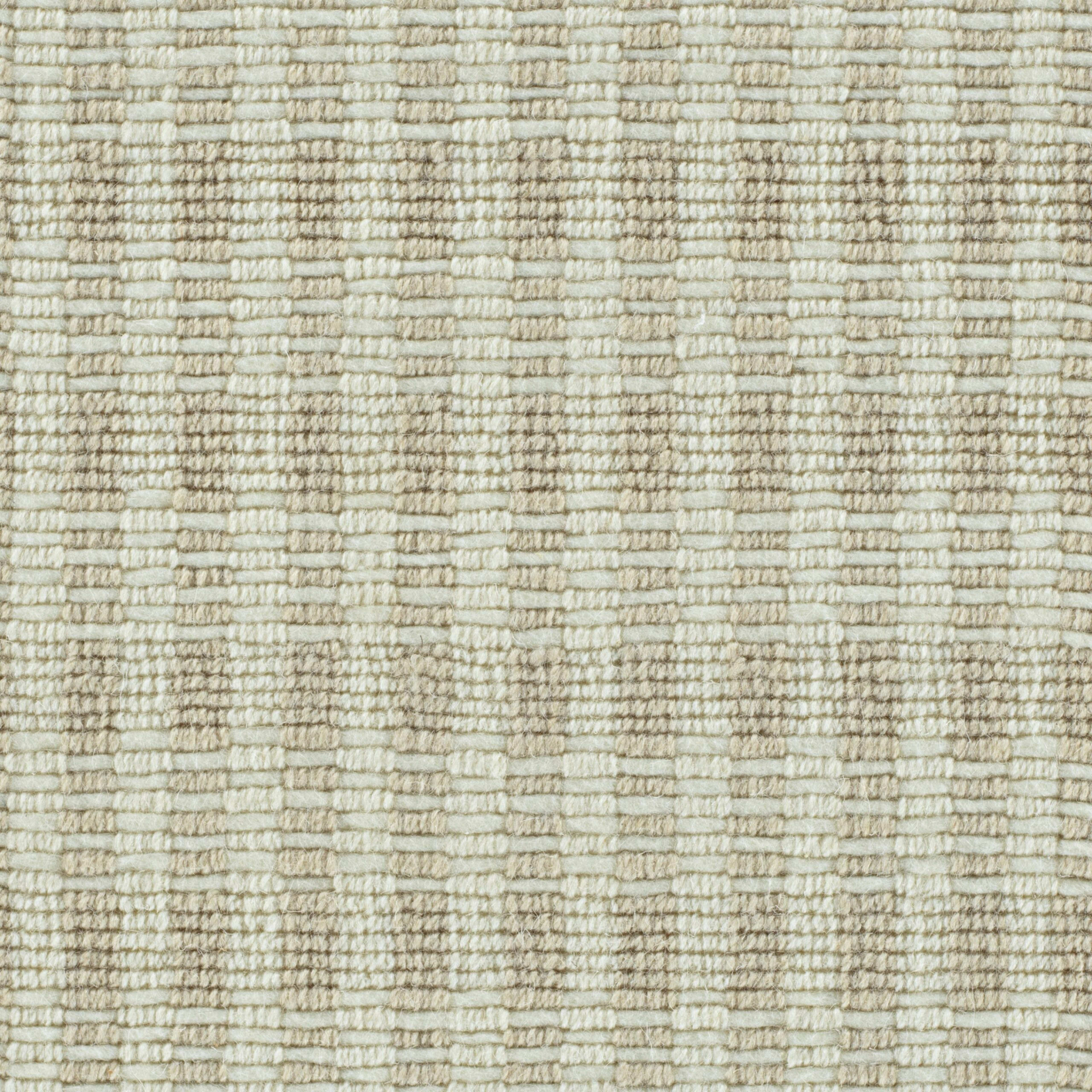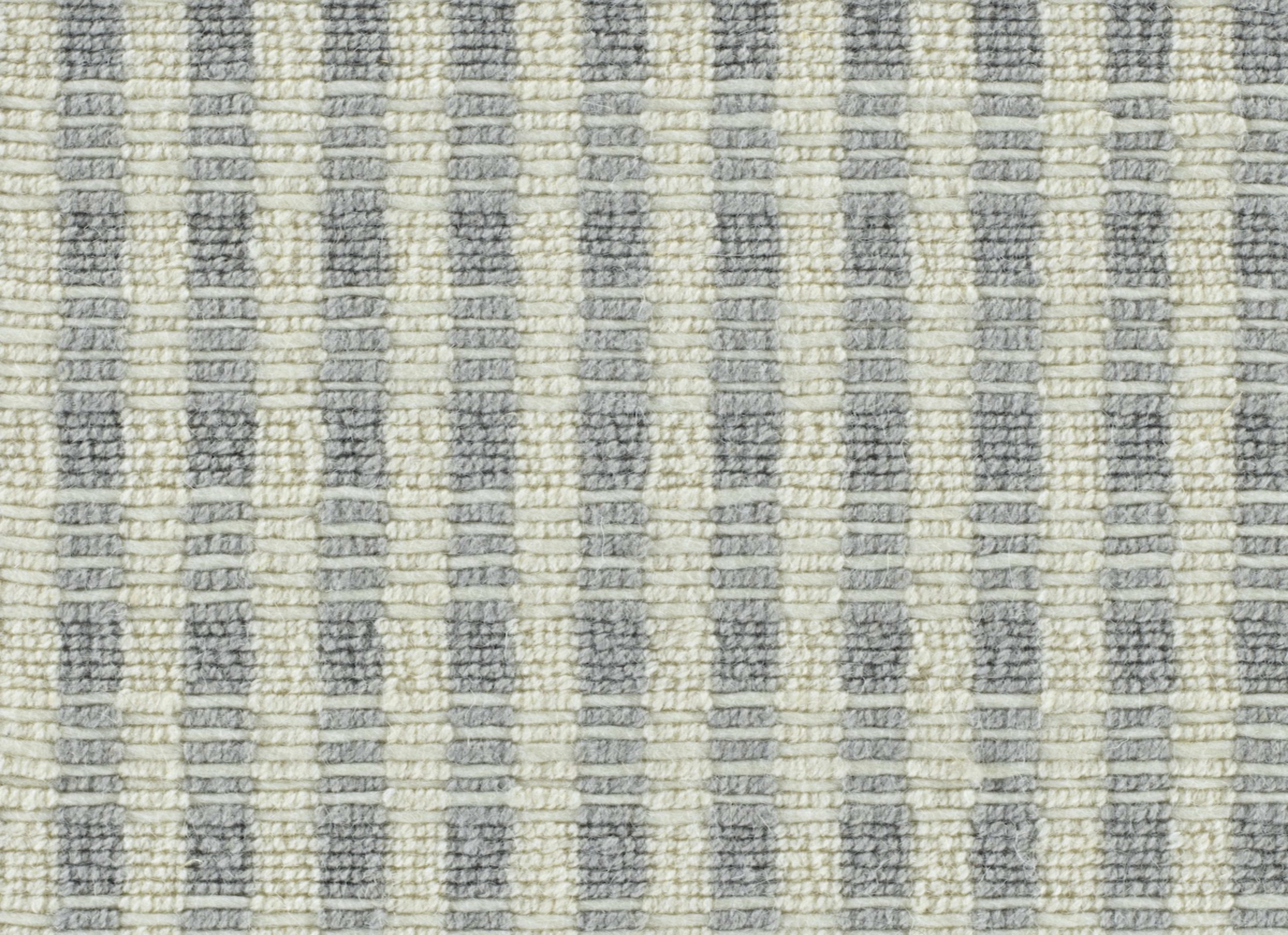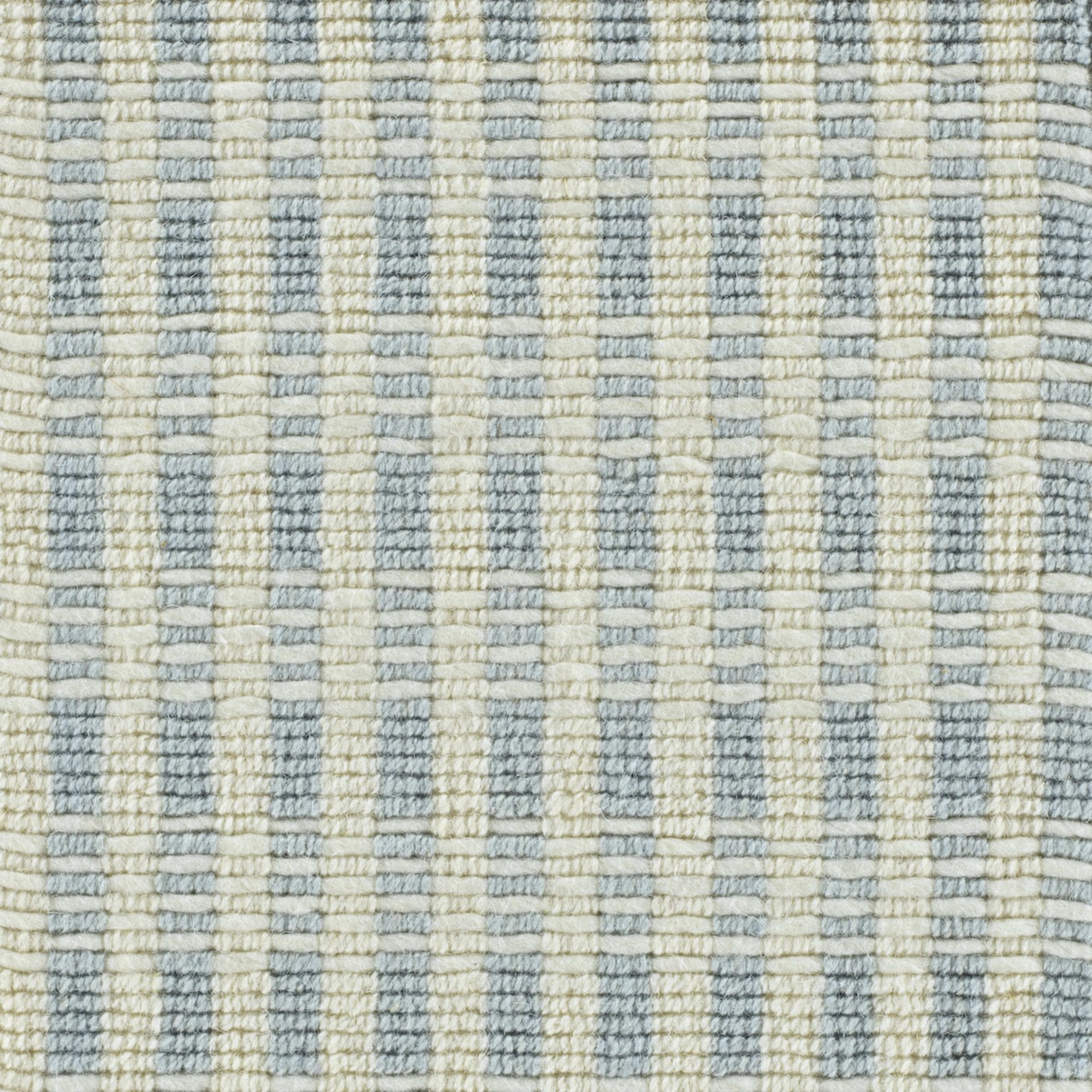 Key Largo combines distinct stripes and small bars, creating a design that merges plaid with an almost deco look. A handwoven flatweave carpet, Key Largo offers a graceful geometric combined with a refreshing color palette, mixing ivory with beige, silver and soft blue tones.